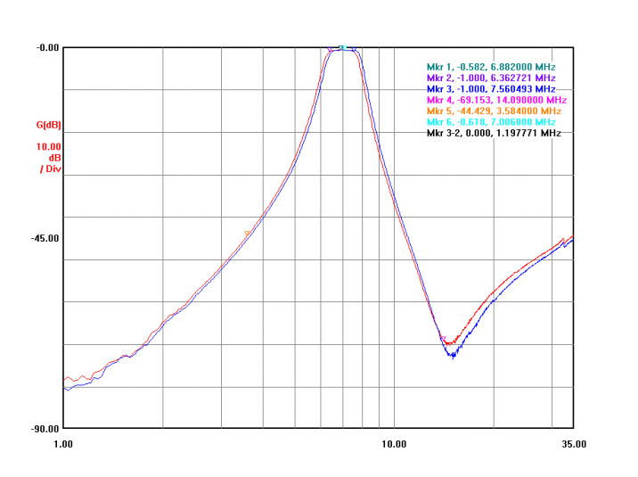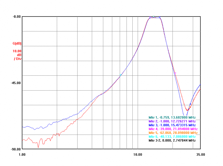 The wide sweeps from the two completed and adjusted filters shown here. The large "bump" in the graph near 4 MHz is not as pronounced with the boards properly grounded and secured in their normal position. To allow for playing around, I purchased a few extra filter board modules. And want to initially add a notch to the 15/20 pair as that is the worst-case coupling combination on the antenna side. Filter fun awaits!!!
