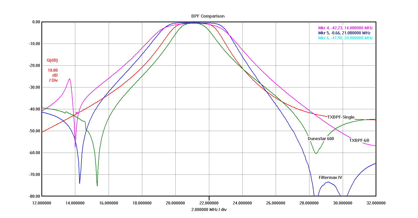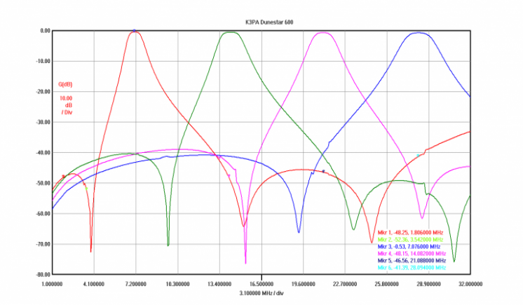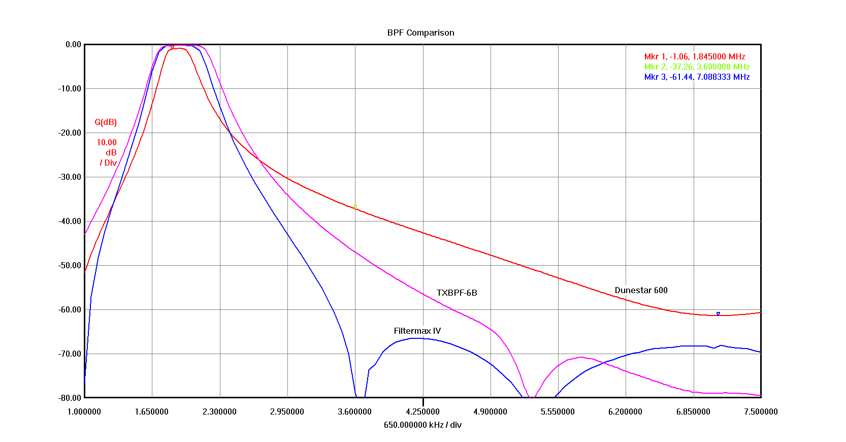 The VNA speaks and the results surprise I've been using the 5B4AGN filters for years with excellent results. So when a friend of mine was talking about setting up So2r, I offered to check out his filters so he could have some measured data to plug into his attenuation calculations. When I stacked the 4 filters on the bench up, the results were surprising. The Array Solutions really looked good. A BPF needs to do two things. First and most importantly, protect the 2nd radio from being damaged by RF out of the first. Here the adjacent band attenuation is the key metric. For this one, "enough to avoid damage" is just as good in the practical sense as an infinite attenuation. And secondly, it needs to attenuate the rig's second harmonic so you can for example work 40m and 80m without having the harmonic content of the 80m transmission wipe out the noise floor on 40m. While the attenuation needed varies with the specific setup, more may not be needed but it definitely does not hurt. Filter loss is another factor, but it's more of a meter mover on the transmit side than big factor on the receiving end. Less loss is better of course, but if you generally run an amp, then a few watts lost to heat in the filter won't matter. I say on the transmit side because the difference between 90w and 100w will not be discernible on the receiving end. Of course some of the biggest reflector battles have been over that statement. Compared in the graphs below are the Array Filtermax, the 5B4AGN and the Dunestar 600 6-band auto-switching filter sets, as well as some 5B4AGN single-band filters I had on the bench at the time from Field Day. The Filtermax performance owes two debts to it's nice plots - first to the design topology, an elliptical (Cauer) type which takes advantage of putting the filter's notches right on the adjacent bands to gain a very nice attenuation boost where it's appreciated most - and secondly they are well trimmed as is reflected in the low loss measured. Having built quite a number of the 5B4AGN filters in the past, I thought perhaps the first unit measured may have not been representative of the normal filter. A second Filtermax purchased a month later had numbers very similar to the first so at least based on those two units, the performance seems to be consistent. On to the data. For each plot, click the graph to view a high resolution view. 5-BAND COMPOSITE PLOTSDunestar 600