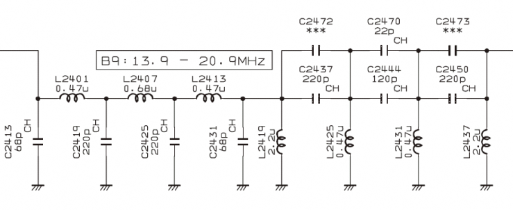 Main receiver preselector ranges, specified in the schematic are: Band | Marked Range | 1 | 1.7-2.1 MHz | 2 | 3.4-5.0 MHz | 3 | 6.9-7.5 MHz | 4 | 9.9-10.6 MHz | 5 | 13.9-18.5 MHz | 6 | 18.5-24.5 MHz | 7 | 24.5-32 MHz | 8 | 47-56 MHz |