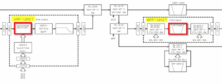 Taking Help Wherever We Can Find It Toward our goal of 135 db total attenuation, the rig preslectors will offer some assistance. The block diagram of the preselector for the FT-2000 is this, showing the VRF and the preselector (BPF UNIT). The VRF analysis will be shown on another page HERE