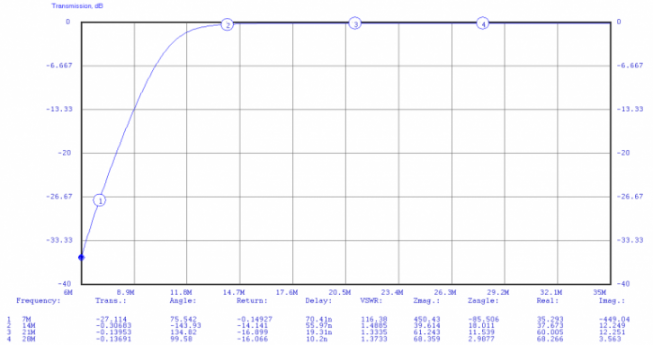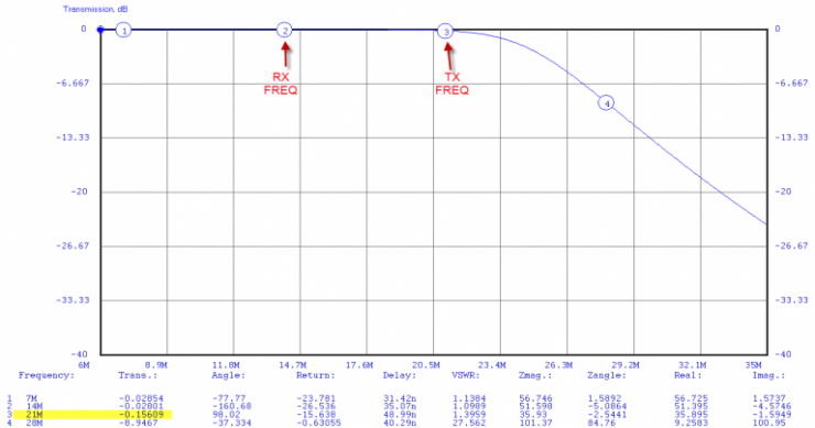 The analysis says that the preselectors' are going to be of some help when the FT-2000 is operating on the next band higher, but the preselectors' are going to offer little help in the case the FT-2000 is operating on the next lower band. Specifically in the case of 15M interference with the rig tuned to 20M, the LPF is of no help. That's because the filter roll-off as well as the corner frequency are quite high.