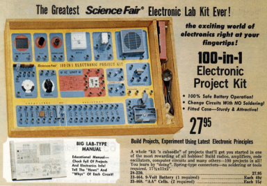 For Christmas one year, at age 10, I think, Santa brought me a Radio Shack 100-in-1 electronics project kit. A variety of parts were mounted on a cardboard backing and interconnections were made per a manual by connecting wires between the spring-like terminals adjacent to each part. That kit opened the door to all the "cool" things that electronics offered. I remember one night setting up a siren from the kit and hooking it to a photo-cell switch. When my door was opened, it broke the light beam and activated the siren bringing quite a surprise to my mom.