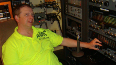 The photo (left) here shows operation on the Queen Mary. I had no idea there was a ham shack in operation but we saw it on the tour. The manager of that shack would not believe I had my license - but in those days I carried a copy in my wallet. Unfortunately, the wallet was in the car - and the Queen Mary parking lot is a huge space making it a long haul from the ship's radio room to the car. Upon return, they did let me have a turn at the mic. I thought it was ironic that there was no code key connected. This shot, from about 2010, shows me setting in front of what may well be the most impressive rack of boat- anchor gear in existence. I was a guest of Thomas NE7X and the Central Arizona DX Club at the time.
