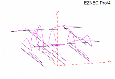 In EZNEC, cranking up the current deflection on the wire frame view of the antenna shows you visually which elements are getting involved. Here we can see both the 40m especially as well as the 17m elements are acting as unintended participants on the 10m band. But how bad is this interaction? To answer that question we look at the elevation pattern in two cases, first is the 10m antenna alone, and then we look at the10m antenna with the top and bottom antennas present.