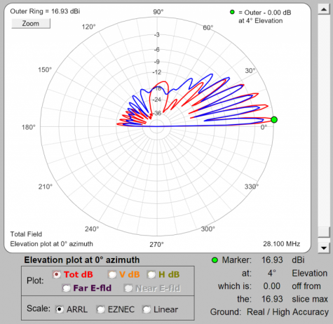 6-over-6 on 10m plus 6 elements fixed on SA The 10m station antennas: Top: rotating 10m JK106 6-element/35 foot yagi at 133' Mid: fixed-on-EU 10m JK106 6-element/35 foot yagi at 114' Lower: fixed-on-SA 5-element/24 foot yagi at 51' & 35', BIP stacked fixed-on-SA 10m 5-element/27' foot yagi at 35' ** Taking What You Can GetThe middle slots on the two towers are left for the unfortunates of the setup; 10m and 6m. 40m and 20m are THE primary DX and contesting bands so the towers were literally built around getting the best possible result on those two bands. All other antennas were put on at heights that were defined by what was available, rather than what would be optimal. Tower assignment depended on which combination yielded the least interference. Because 40m and 15m don't play well together, they must be on separate towers meaning 10m goes with one, and 20m with the other. If 20m and 40m were on the same tower, one would be a compromise from height at a minimum. So 20m gets it's own tower seperate from 40m and lives with the 15m stuff. That leaves poor 10m as the last man standing and he's assigned the open spot on the 40m tower. The 10m beam sits between the 40m Moxon above and the 17/30m dual bander below. Unfortunately for the 10m beam especially, both antennas interact to an extent. This is hard to get around because as frequency goes up, even sub-features of surrounding and mostly non-interactive antennas can get into the interaction game. Interactions in the worst case ruin patterns, kill gain and screw up SWR. But if you are lucky, the interactions are minimal and while you take a small hit on each of these, the antenna can remain operational for the most part. I got lucky because that minimal but present interaction case is exactly what I have with top 10m. And it's great that the result was good, because the only alternative other than an additional tower (which is not happening) is moving to a location at 30' up on the test tower. Fortunately the array ended up looking pretty decent despite shortcomings of the top beam's location. Models