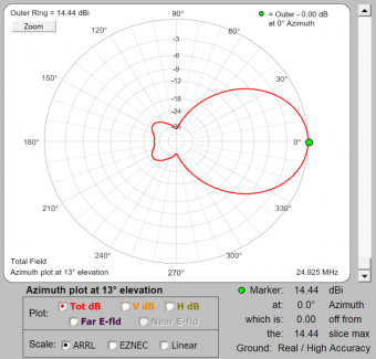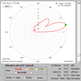 The antenna is simple in configuration - a 4-element type using the available boom length of the OEM LJ (24'). With this kind of old vintage beam rebuild often the OEM used too many elements and without a specific added goal (broadbanding, etc) as part of the rebuild, then the first trick is to determine the right element count. I normally do that by looking to see what the best gain/pattern is with (for example) 4 elements to serve as the baseline. Then adding a 5th element, pushing the 5 elements together so they fit on the boom, and reworking the optimization is next. If the added element case does not add significantly to the pattern or the gain compared to the earlier baseline, then I use the lower element count. More elements just for the sake of having a higher element count alone is a bad choice here in wind & ice country. Such was the story with this boom - 4 elements was the right count. The 12m band is narrow and a hairpin match is fast to implement and would work fine allowing me to push the optimizaiton a bit more to squeeze additional gain. The beam is mounted on a tower near the house that I normally use for testing antennas but it's otherwise free of antennas. Unforutnately at 33' it's pretty short. It works ok in this case because 33' above ground for 12m is not bad at all. Model PredictionsPatterns were very nice with a tight rear and a thin front azimuth profile.