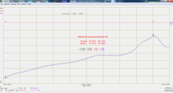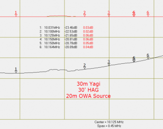 Another view of the finished antenna shown here under test. Only minimal adjustments were needed compared to the model to bring the antenna into tune. Measured F/BI tested the antenna's front-to-back with the beam on a 30' tower. A beam about 175' distant was used as the reference. The test is conducted by pointing the test beam at the reference antenna, running a VNA through-cal to establish a zero baseline, and then rotating the antenna away from the reference. The path will show loss (or gain if the cal was taken with the beam pointing away) - and that difference value serves as an indication of front-to-back. The actual values are less important than the general position of the curve which we hope is showing it's peak somewhere near the ham band. In both cases the F/B was very nicely represented, especially in the 17m case. The distance between the two lines in the plot represents the F/B of the beams. Ignore the +/- sign of the value - the beam was so huge and my rotor was having a hard time turning it so I did not want to rotate it another half turn to get the two references back to both positive or both negative. 30m plot is shown at left, 17m plot shown at right.   One Last Overlooked DetailOnce the antenna was mounted on the 40m tower, I had a rig on each antenna, eager to check it out. Everything looked great but at some point in the testing my Yaesu FT2000 had gone more or less silent. Hmmmm. After some investigation I realized that I had failed to check antenna isolation between the bands. The VNA proved what I had suspected... With a transmitter on 30m, the isolation is very good at about 46 db. But transmitting on 17m the pickup by the 30m element is only 11 db down. Zaaaaaapppppp goes the preamp. I had purchased an additional set of 5B4ANG switched BPF kits but never got around to building them up. Based on this experience - that would be next on the list of things to get done before allowing 17m & 30m simultaneous operation again!