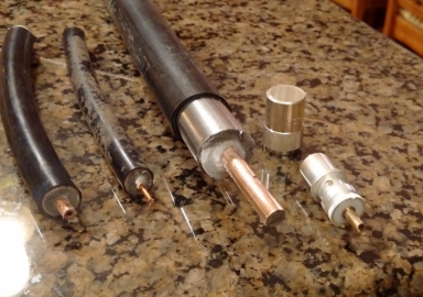 The individual verticals are fed with RG11 foam centered coax. The high 0.81 VF resulted in long runs and easily accomidated the land topology as well as reaching across the concrete base from the DXE hybrid controller. Feedline from the 40m tower switch about 325' distant to the 80m antenna site is made using the 7/8 solid wall aluminum hardline (shown at right) with RG213 pigtails on each end - no attempt was made to minimize the impeadance bump for the transition as I thought on 80m that would be of no concern. 80m DipoleThe 80m dipole is suspended from the 20m tower at about 55'. A 4' length of angle stock is mounted to the tower giving a couple of feet stand-off from the tower for the center. The height is limited by the antennas on the tower and interactions with the 20m stack which was considered to be the higher priority. It's fed with Davis Buryflex RG213 cable that runs down the tower and hooks into the DXE 2x8 coax switch at the base of the tower. The ends of the dipole are suspended by rope runing to trees located about 200-300 feet out so the dipole has somewhat of a "V" shape. The ends of the dipole are around 40' off the ground at the low point. In use, the dipole is the better antenna on 80m within perhaps 500 miles. With distances beyond this, the 4-square is the better antenna in almost every case. The 4-square is often the better antenna in storm season because the directivity allows a reduction in QRN where the back side of the 4-square is against the storms and the guy being worked is on the front side. On receiving the HiZ 8-circle works fine on 80m although most of the time the full size 80m 4-square provides better results - somethign I have noticed on the 40m 4-square over the years as well. |