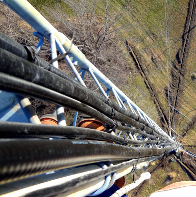 A look at the feedline runs as they head down the 40m tower. The final beam to be mounted was the JK402T 2-element beam on a 22' boom. It mounts on the top of the mast. Last to be mounted was the FT5ZM 3-element 10m beam mounted at about 50' and fixed on SA.  An additional JK106 and a modified KLM 5-element will be mounted at fixed locations beaming EU further down the tower providing a 3-high stack when the top beam is pointing to EU. Populating the 20m Tower