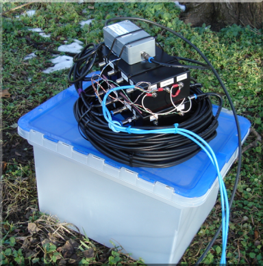 The short-delay/long-delay cables are not part of the standard system offering, however, the Hi-Z guys will build those up for you at a reasonable added charge. With these delay cables added, the entire system is ready to hook up on arrival. Delivery took only a few days even with the delay cables added to the order. I pre-assembled the outdoor items into a nice stack and hauled it out to the field. VerticalsOnce the order was made, the task of identifying the exact location of the 8 verticals was tackled. If you have an open field, then this is very simple. But if you have trees and brush in the area, it's quite a bit harder. The final result is shown in the picture below. 4 of the verticals can be seen (indicated by arrows) . The control items are in a large green-colored plastic tub (inside the green circle).