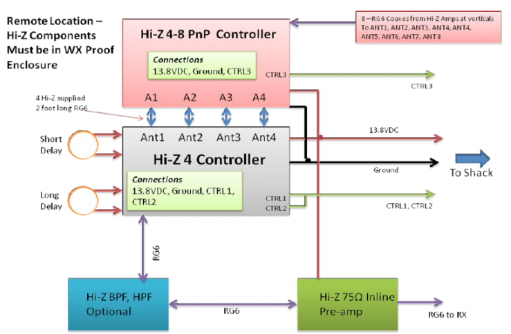 Modern Magic --> Details on the site, neighboorhood and beverage are found HERE <-- The Hi-Z 4-8 pro circle array was a concern given it's an active array and it's 300' distance to the 160/80m. But the Hi-Z guys told me not to worry - and they have been right; the array has been solid since it's installation. When we bought this QTH, my complete lack of experience with outdoor antennas left me completely unprepared to be an adequate judge of a QTH's suitability for receiving antennas. However, we seemed to have got lucky this time and things have worked out pretty well. More details on the RX antennas follow. Directional Receiving ArraysOne of the first lessons a budding low band want-to-be contester learns is that receiving success is all about controlling the noise. This is a difficult concept to grasp because on the higher bands, we generally talk about the other guy's signal - and how a beam, etc, may help that. But the point that W8JI was trying to make when I seriously first considered this at the 2010 W0DXCC convention was that putting the null on the noise was the right approach. So when looking for a low band solution, I wanted to pick a ready-built solution that offered a good ability to precision null the noise. And that would fit in the space available. Initially, I considered building a pair of bi-directional beverages using the available DX-engineering materials. However, without having anything in the junk box, all the components would have to be purchased and the combined cost was significant. And while a beverage for the NE/SW direction would not be difficult to put up, the SE/NW direction would have to run along a set of trees on the property which (at that time) could be reasonably called dense forest. With the ice we have here, falling tree branches, etc, would be a constant challenge for that SE/NW beverage. The competing solution was to consider one of the dedicated receiving array systems - something I had heard of but had no prior experience with. Initially I considered a 4-square type for 160-80 as the goal but as I got further into it, the final decision was to go with a broadband version of an 8-element circle array. The considerations that lead to this choice were several and explained below. The objective comments about each item are here - as well as some of my thinking about each at the time as I remember it now... First, the buffered array sizes were reasonable. While I have plenty of land, a lot of the area was covered with tree, brush or otherwise cluttered. My goal was to place the array as far as I could away from any other source of QRM, and to try to stay away from the eventual location of the 80/160m vertical (planned but not built at that point). And with winter coming fast (it was November already) and temperatures dropping, there was not time for a land clearing operation. Full sized receiving systems can be simply huge (both in height and in ground footprint) - in some cases, so size was a key selection criteria. [Mental thought at the time - the area where the RX array needed to go was filled with poison ivy and overgrown live and dead trees. Finding the right place to put a few verticals was going to be tough the larger that circle became. A vote for the buffered arrays here.] These smaller arrays use a voltage-fed buffered vertical approach which means the ground system can be a simple 4' ground rod. The reason unbuffered passive arrays require a large ground is because the feed point impedance is so low - which makes ground losses a major focus that is what drives the big radial fields. The buffered type has a very high feed point (around 50K ohms) making a small rod a low-impedance ground connection, by comparison. Great - no ground radials to lay down - especially since that would have required a lot of ground prep as well! [Mental thought at the time - crawling around on freezing and wet ground clearing radial fields vs. hammering in a few ground rods - buffered array of some kind is the clear winner!] Next, the verticals themselves are non-resonant and relatively short. Typical sizes for vertical elements are in the 7-25' high range. The larger the element, the more signal there is. However, as the element is larger, the element starts to move toward resonance and the feed point changes with frequency to a greater extent as resonance is approached. Buffered arrays with ideally balanced verticals and feeds can have amazing back-side rejection. That balance is harder to maintain the closer to resonance you go. This 7-25' range gives the builder a lot of flexibility on the materials used. [Mental thought at the time - I could use some 10' lengths of electrical steel galvanized conduit, a bit of PVC and some short electric-fence-post material all of which were available at the local stores. And if the 10' proves too short, then next spring I can expand them to nearly 20' just by adding an extension of conduit. I can save some bucks here with this simple fabrication plan - but it limits my height. That's great because as I look at the trees, cutting away branches 20' up is another challenge I'm not ready to handle just yet. That does it - buffered solutions of some kind are the winner.] And finally, the topology of the array is another variable. Here there are a couple of companies and a lot of systems to pick from. The 2, 3 and 4 element systems are most common, with 8-element systems generally being the most sophisticated - more elements generally means more directional flexibility. Active systems tend to be either single-banded with excellent performance - or broad-banded (meaning 2+ bands coverage) but trading some performance away in exchange usability over a couple of bands. [Mental thought at the time - I determined that the 4-element system would do the trick. But considered that this is the kind of thing that you buy one time - and use for many moons. Also, the big boys have the 8-element types. So I eventually ordered the 8-element 