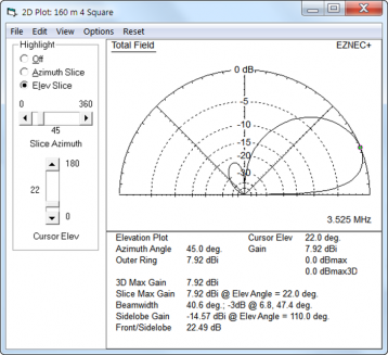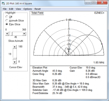 Broadcast Band IMDThe system worked fine right from the start. However, on my bandscope, I could see some spurs showing up indicating some IMD products creeping up from the AM broadcast band. In discussing the problem with Hi-Z, they suggested I try some Hi-Z supplied passive notch filters. You can see the small filter attached to the terminals in the photo above, right (white small tube). I added some sophisticated weatherproofing (a bit of black electrical tape) over the top end to keep the water out. And that was the end of the IMD from the circle. Closing Comments - Hi-Z 4-8 PRO circle arrayMy first experience with an active system has been a good one. Rotating the array can be an amazing experience as you click from one to the next and see a given signal pop out of the noise. I eventually got the 80/160m vertical put up right before the 160m contest (about a month later) and that was a fun contest as a result. No end of signals to work. And from a noise standpoint, there is no comparison with my transmit vertical - 100% of the time the circle is better. The circle does have one behavior which may or may not be of benefit. That is the same thing that makes it so quiet (directivity) is also a problem when you don't necessarily want as much directivity (contesting). If you are lucky enough to have a strong transmit signal such that you can leave the array beaming in a single direction, that works great. But I sometimes need to work that direction knob in the shack quite a lot. And for a fast exchange contest like CW, that can drive you nuts as well. The lesson here is that there is no free lunch. If you get your quiet performance through directivity, be aware you will need to get that directivity working in the sender's direction! Which leads me to the one and only criticism of the system. As delivered, the direction switch has a hard-stop at 0-degrees (north). My preference is to have no hard stop, and if a hard stop is required, then let it be at about 250 degrees or so. My solution for this was to turn the control box over, so that it sits upside down, that move the stop to the 270 degree point. And then I rotated the wires in the array, moving each vertical ahead 4 slots (so vertical 1 became #5, vertical #2 became #6, etc) which restored the switch pointed up = array beaming north functionality. It's almost not noticeable other than the Hi-Z label is inverted. I also moved the rubber stand-off to the top (now bottom) of the case and it's worked great since. Not the most elegant solution but it worked for me! Modeling the CircleA proxy model of the 8-circle is to build a basic 4-square model. Plots for the 8-circle from this type of model are as follows. This is based on the compromise phase line lengths (a split between max-RDF and max-F/R).