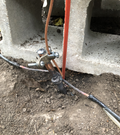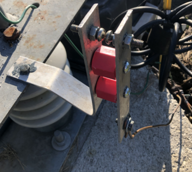 The tower is of an insulated base type and to help contain the voltage rise at the base, I added a spark gap shown left. The gap is adjustable via the two SS screws. A short length of #6 solid runs down to the ground network.