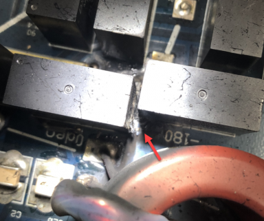 Shown left is the arc damage between the two closest relays and the circuit board.