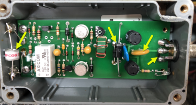 In the field, the HiZ array box was warm to the touch - odd. Checking the current drain showed it pulling about 1.7A vs. about 700 mA in the normal case. I disconnected the antennas and other lines from the unit and pulled the two boxes as well as the phasing lines out for a trip to the bench. When I got the lid off, it was clear that a highly technical diagnosis of "crispy fried guts" was confirmed. I talked to Lee at HiZ about what I found and he suspected that there would be antenna buffer amps showing shorted input DC block caps. So a later trip out to the field to pull those was needed as well. What I think happened is that a nearby strike (either transmitted through the ground - or directly to the tall 40m tower through which the HiZ feedline is routed) caused the buffer input to see a much higher voltage than the input blocking cap rating of 25V causing the short. Once the cap shorted, the supply back at the controller tried to feed the shorted buffer's endless current demand, eventually causing the small 1mH chokes in the controller box to overheat and internally short. That's what the discoloration on the board is from - the cooking inductors. HiZ Repairs & Hardening- Antenna Buffer AmpsIn checking the buffers, one was dead (with a shorted input cap as Lee predicted) and another one buffer showed blackening of the input cap however it remained functional. The OEM DC block cap is a 25V 1 uF tantalum type which has excellent low frequency response but in my experience tants do not play well with over voltage conditions. I replaced the cap and checked functionality of the buffers - all good. By way of hardening the buffers against future lightning, I added 4 items to each buffer (yellow arrows): 1. A 75V GDT across the input. The inputs of the buffer are shorted when the system is powered down but it normally runs 24x7 - and has been that way since I first put it up in 2011! The GDT would cover the case of a big spike on the antenna side, hopefully protecting the input.