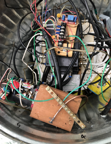 A couple of other improvements were implementing the previously mentioned remote power switching (blue relay on the PCB near the top of the photo below). Wires are sort of a mess but you can make it out clearly. The wood mounting board holds a terminal strip that serves as a convenient tie point for the 3 control lines, +15V PS line, and the "PS-on" relay control line that feeds from the shack. Each of these lines has an added TVS and bypass cap to ground.