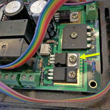 I did not initially realize that the Green Heron controller on the 40m tower was damaged until I noticed that the rotor seemed to turn very quickly - and that it tended to over-run the selected direction by 5-10 degrees. Two things that definitely were not happening before the "event." Comparing the output of the two GH controllers in the shack (the 20m tower operational one and the 40m tower suspect one), it was clear the PWM function was not working. The controller was not ramping up and down the rotor speed, but instead was slamming the rotor with full power with each turn instruction. And what I was seeing as overshot was due to the rotational inertia of a lot of big antennas straining against the braking of the SPID BIG RAK's worm gears as it fought being spun by the antennas. I cannot imagine what the forces were on that gear set... Fortunately nothing seems to have been damaged. The GH guys were very helpful in identifying the likely culprit which turns out to be a FET IC (yellow arrow). Replacing that part was quick and easy, not even requiring the PCB to be pulled from the case and restored proper operation.