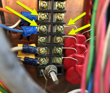 More MistakesI was surprised at the GH controller damage because it's well clamped against just such an eventuality. There are big MOV in the field, at the shack entrance plus the internal TVS diodes clamping the output from overvoltage. Well upon close inspection, there were those MOV mounted, but in both cases they were not actually working as intended - due to installation errors! At the tower I found this odd connection, shown left. You can see the MOV are connect one-terminal-off from correct meaning in this case one of the rotor pulse sense wires was left unprotected. Oops again! And back at the shack, I found the MOV properly across the pulse sense line, but the ground side connection of the MOV was not screwed down tight making them worthless. I corrected both of those. One observation when checking this out was that the TVS selected for the output is a bi-directional 70V type. The max voltage of the output FET is also 70V so it should be protected, right? But it got blasted somehow. Perhaps vial the pulse line which was unclamped external to the box and that induced or found a path inside the controller - no idea really. I also speculate that perhaps the TVS may have allowed the motor line to lift high enough to pop the FET even with the TVS because the avalanche curve of the TVS - while being much flatter than a MOV - still has some slope to it. Hard to be sure. By way of additional protection, the peak voltage of the controller in my setup was measured on an oscilloscope at about 35V. So I added 38V TVS to all the external rotor wire leads on the back of each of the GH as an added clamp. And I checked the 20m tower MOV for proper installation - no problems found there. Fingers crossed! |