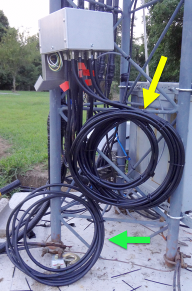 The Monostacker PCB (shown below) is housed in a small aluminum box. The impedance matching magic is accomplished with two lengths of quarter wave 50-ohm, one of 75-ohm and one more of 35-ohm coax. These stubs are nicely bundled and mounted against the tower as shown at left (yellow arrow). The padder lengths (green arrow) are laying against the tower while I check out the system. Once checkout is complete I will add those to the others leaving a less cluttered set of wires. There are 7 control wires plus ground that drive the various selection combinations. 4 lines select one or more of the 4 antenna combinations. And the 3 remaining select one or more of the quarter wave matching lines. Construction was straight-forward although quite labor intensive with respect to fashioning the aluminum face plate with the SO239. I am told that DXE may offer this design in the future so guys wanting to use a similar setup will have an easier go at it.