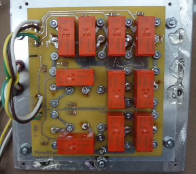 Getting Stacks Under Control using K7EL's Current Forcing Phasing Method Download the Monostacker docs by clicking HERE The stack matching box used here is the Monostacker. It implements a switchable method of driving up to 4 beams with correct 50-ohm in-phase matching based on the current forcing method popularized by Roy Lewallen W7EL. The Monostacker is essentially a collection of relays and a few lengths of quarter-wave feedline switched into the mix driving the right combination of feedline lengths. The system is single banded - hence the "mono" in the name - but given the entire station here is built out of monoband antennas so it's a good fit for what is on the towers. Popular alternatives use phasing transformers and in some cases discrete L/C to do the similar thing. A requirement for the phasing to work right is that the feed lines to individual antennas are the same length and that the lengths are odd quarter-wave multiples of line. I did not build the feedline lengths in advance preferring to use hardline runs up the tower and then bumping the runs to the correct magic length by adding a bit of padding feedline at the base of the tower. The needed padder length was determined by measuring the electrical length of the run from the base of the tower up to the feedpoint for each antenna using TDR. I chose to put the matching box at ground level which simplifies the build and maintenance end, but it comes at a cost of longer runs to each antenna which I have mitigated by using big hardline runs up the tower and making as much of the Monostacker interconnect out of hardline as well. The big boys tend to put the stack matching stuff up on the tower to minimize the feedline runs - but knowing my luck I would probably encounter a failure and have to climb a tower to do a swap in the middle of winter - no thanks! THE MONOSTACKER BUILD