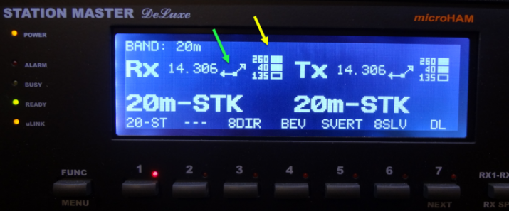 When the stack is not in use, all the antennas are grounded providing one more path to ground for lightning should it come my way and make it past the other discharge paths. Note that I only am using 3 of the 4 antenna positions on the switch and that leaves me an unused port for some other antenna if needed in the future. While there are a lot of wires involved in this setup, it compensates in being completely flexible especially when matched with something like the SMD which can take full advantage of the granularity. Here's what the SMD display looks like at the op position. The graphic under the yellow arrow shows that the top two antennas are selected - the top rotating and the mid fixed-on-EU (hollow box signifies an idle antenna). The 260 number shows the top rotating antenna is pointing to the west at the moment. And the green arrow graphic reflects the relative compass headings of the two antennas.  THANKS!I want to thank W8WWV and AC6LA for their prior work on this and for answering my many questions on this and other projects over the years. And to the unnamed gentlemen who have provided me with some key materials used in the build - I am very grateful for the assistance. |