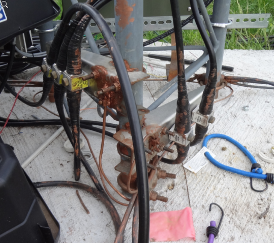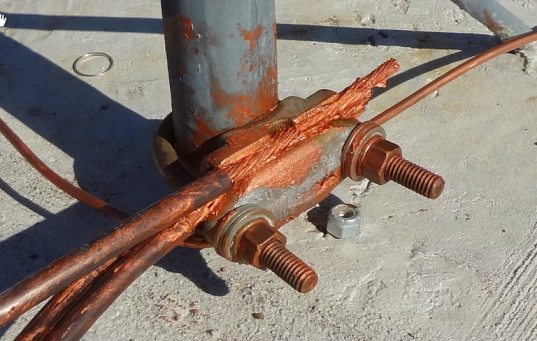 A Hager bronze clamp is used on each leg with the closest 2-3 ground wire feeds connecting to the clamp. An additional #6 solid copper bare wire runs between the 3 legs. Liberal use was made of copper-containing conductive grease in the hope that may assist in corrosion prevention over time - it makes quite a mess!