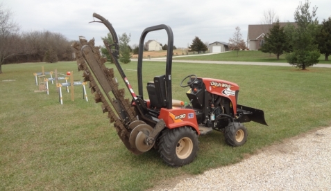 There is about 2000 feet of trench here on site and that was all finished in about 4 hours with this Ditch Witch self-propelled Cuts about 6-8" wide and up to 12" deep although the machine will dig deeper. machine. Highly recommended for high volume trenching. Digging by hand is of course possible but the machine is a huge labor saver especially when you have to navigate roots and rocks. Shack Entry GroundingHardline runs from the towers enter into the shack through a wall-mounted junction box. A local ground network of 20 rods are constructed in a similar fashion to the towers.