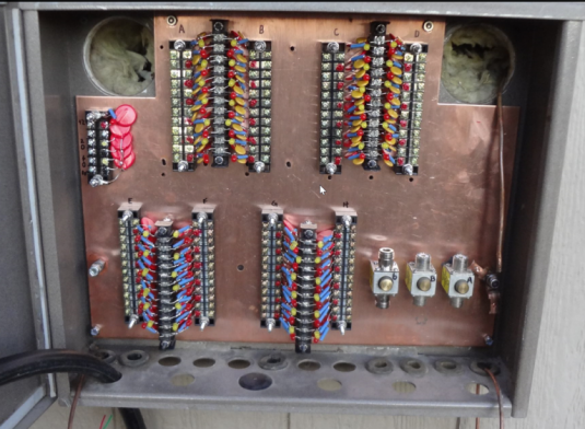 The shack entry box is built by KF7P Chris and is an excellent platform. For the latest tower setup I mounted terminal strips on the backing plate to accommodate MOV clamps for the 100 control lines that exit through the panel. Most control lines also have LED/resistor/capacitors on them which are a huge time saver when troubleshooting. The site topology is focused on So2r so only two hardline runs are needed from the towers back to the shack - the 3rd connection is for a dedicated 6m feedline. The copper backplate connects via two runs of strap down to the ground network.