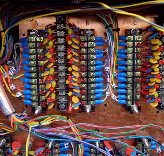 Here's a close-up photo showing the components mounted to the terminal strips.