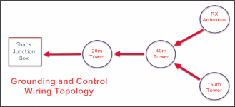 The system is composed of 3 towers arranged in a daisy chain setup. A junction box at the shack (house) terminates coax and control lines to ground. From there control and coax run out to the 20m tower, onward to the 40m and finally out to the 160m vertical. Each tower has a grounding system explained in more detail below. And at each tower are various antenna switches for band selection and for managing the stack combinations. There are 3 hardline runs between each tower and then another 3 sets to the shack. Each tower has a dedicated set of control lines - 48 wires for the 20m tower and 50 wires for the 40m tower.