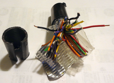 Control wires from the shack terminate into the junction box. Each wire is equipped with a shunt connected MOV for lightning as well as a LED/resistor/cap combo which provides fast indication of which lines are active. The terminal block on the left is complete; on the right wires are not connected yet. Wire pairs are twisted and further marked with letter beads to help with identification. The backing plate for this box is a 1/4" thick aluminum plate. Strap runs from the bottom of the sheet through the bottom of the box and ties into the tower ground ring wire.