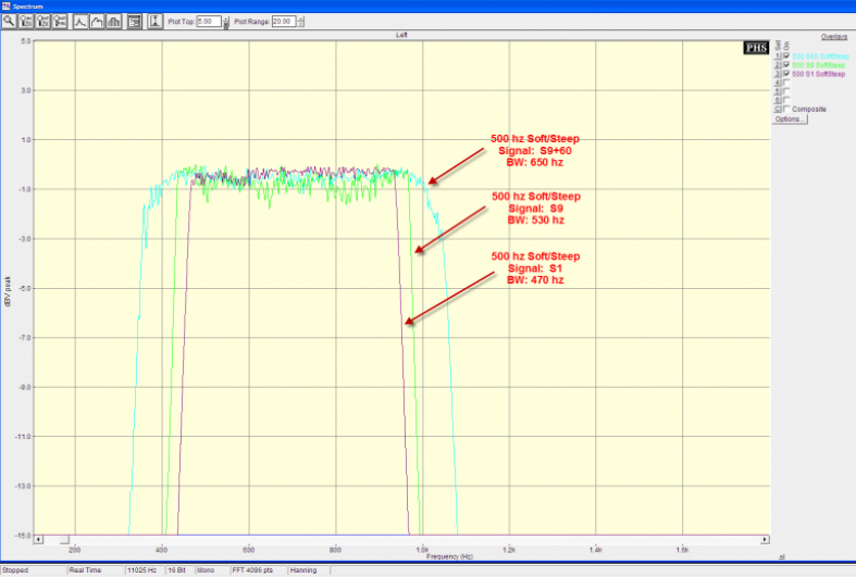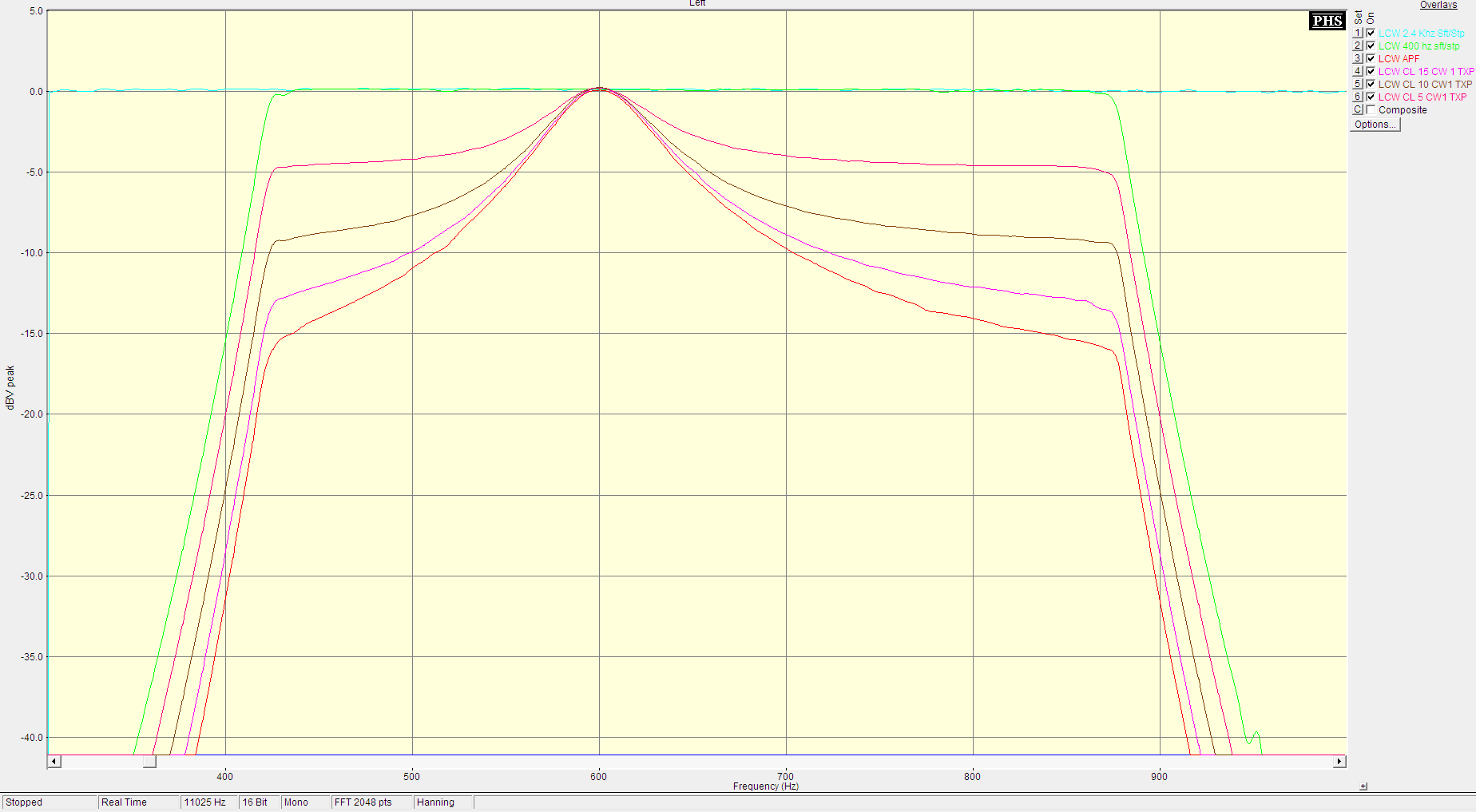 Finally, we consider the effect of the contour width in comparison to the APF. Here we consider a 400 Hz LSB CW mode filter with soft/steep form factors. Below the APF trace is represented by the bottom, most steep shape case. The green line is with the APF disabled showing the square top DSP filter shape. The contour widths are altered - and to allow for a matching of the various shapes, I have shifted each of the plots down so their peak values line up. Of course, the rig would provide the significant boost and the shapes would not line up in this way. But this organization allows you to consider the effect of other settings - as an alternative to the APF if you were to find the +20 effective setting of the APF too narrow for your preference.