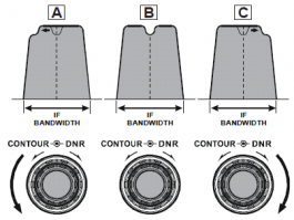 For the Yaesu firmware wish list: As a practical matter, I don't think the filter slope is very critical after the first perhaps 20 db if we are talking about general contest or DX work. But perhaps a better way to provide increased utility would be to have user-adjustable ultimate attenuation in the stopband. I notice that Flex is now starting to advertise how perfectly vertical their filter "brick wall" response is. While it's very nice for show and tell to visiting hams, generally an operator, especially with CW, wants to be able to hear the other stations above/below with some amount of amplitude. In fact, the PickAStar group with filter legend Bill Carver has added a very interesting feature where the ultimate attenuation of the filter is adjustable. In most rigs, the filter attenuation continues down to the limit of the rig's DSP dynamic range (around 60-100db, depending). The FT2000's DSP has a dynamic range of around 90db (from the rear panel AF OUT jack) - the slope is not vertical, but it's tremendously deep. Personally, for CW work, I almost never need to move the passband (using the SHIFT control). If Yaesu were to add in this feature tied to the SHIFT control (perhaps pressing A+adjusting the SHIFT), that would be a very useful tool indeed! Contour The APF feature is not very useful to the SSB operator. And here the CONTOUR function comes to play. Yaesu's operation manual does explain the function of the contour control pretty well, and presented here below are some graphs to help us put some engineering values to these various setting numbers.