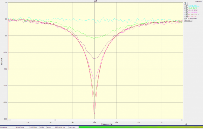 The actual rig filter plot is very smooth - the variations in the plot you see here are related to the speed at which I swept the curve and these wiggles in the plot don't exist in the filter. In the graph below, level is fixed at -30 dB, and width is adjusted over the range of 1-11. Notice the slight tilt down on the right side of the graph: