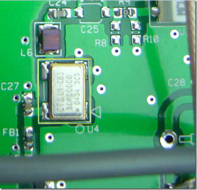 Oven Controller Side The crystal used was supplied by ICM. The turning point, as recommended by Jim, is set at 50C. ICM is the go-to company for anything crystal. The 4 resistors marked 121 are the heating elements of the oven controller. The smaller chip in the center of these 4 is the thermistor. I soldered the case of the crystal to the slot ground to ensure a very good thermal contact. In the final installation, the left-most 121-marked resistor was removed. This reduces the heat production of the unit but it also has a direct reduction in the amount of current the unit draws. With just the 3 121-marked resistors in place, the module draws about 180 mA.