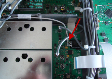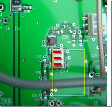 The OCXO requires an 8V regulated supply and the LO board of the FT-2000 provides that without trouble. IF-2000 Board Prep After getting the OCXO built and tested, it's time to fit it onto the IF-2000 board. Here there are 3 items to attend too: 1. Remove FB1 - this removes power from the CTS oscillator 2. Remove R9 - this disconnects the CTS oscillator output from the mixer input 3. The output of the OCXO is fed to the mixer's input (the white component, with the red arrow pointing to the input). Remember, this is 80 MHz VHF land, so keep leads short. I soldered my center conductor of the mini-coax to the mixer input, and tacked the coax ground to one of the unused solder points below R9.
