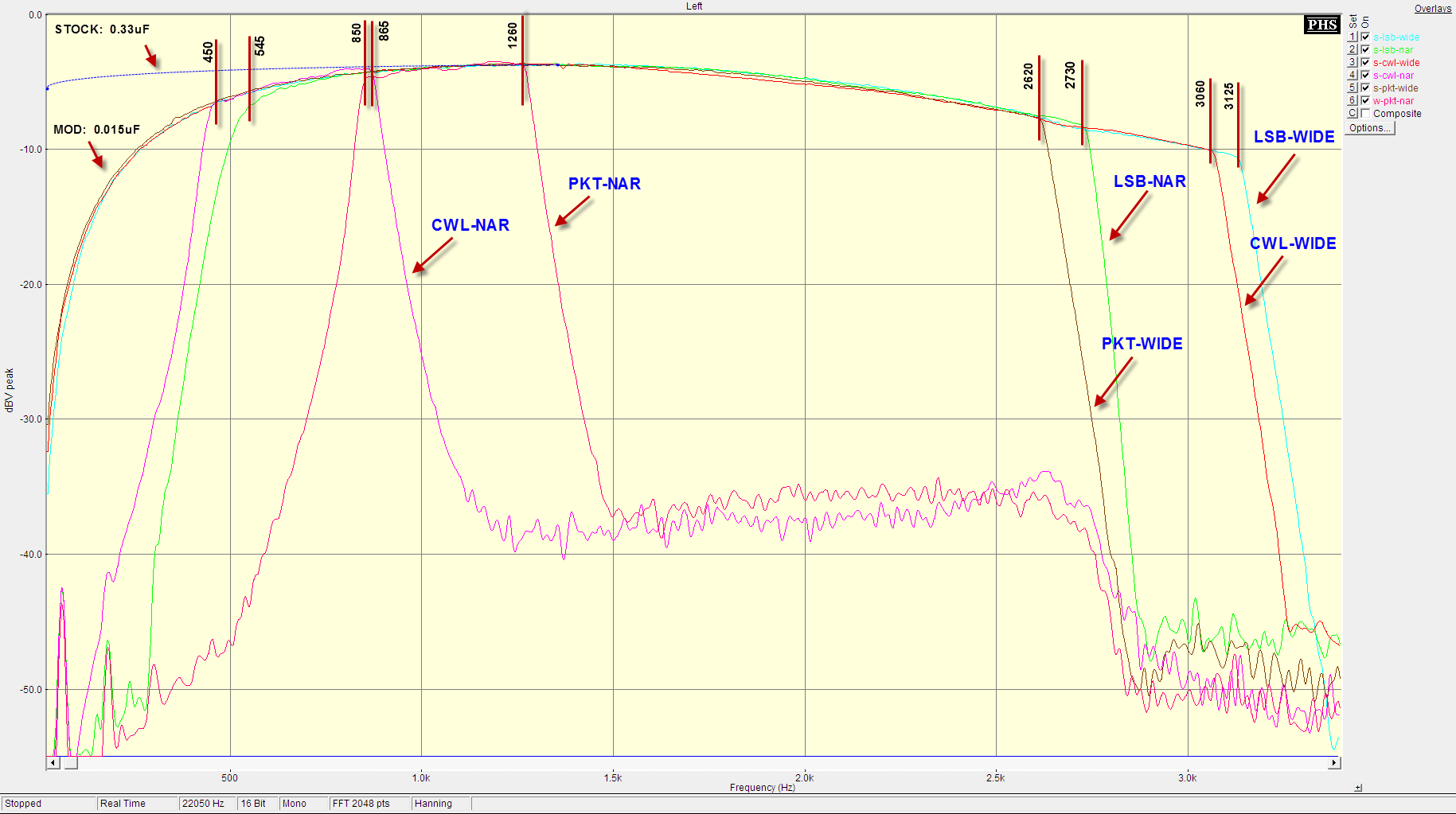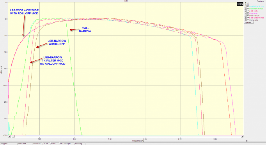 The plot compares the filter response of 3 operation modes, in both the wide and narrow settings. Calculated passband widths are given in the following table: Mode | Filter Mode | Fl @ -1db | Fu @ -1db | Width @ -1db | LSB | Wide | 50/450 Hz | 3125 Hz | 3075/2675 Hz | LSB | Narrow | 545 Hz | 2730 Hz | 2185 Hz | CWL | Wide | 50/450 Hz | 3060 Hz | 3010/2610 Hz | CWL | Narrow | 450 Hz | 865 Hz | 415 Hz | PKT | Wide | 50/450 Hz | 2620 Hz | 2570/2170 Hz | PKT | Narrow | 50/450 Hz | 1260 Hz | 1210/810 Hz |