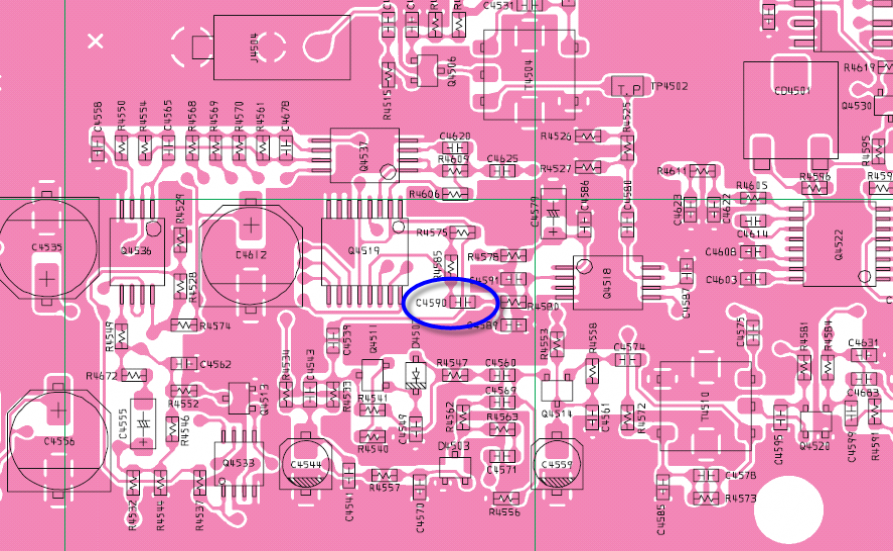 A Mod for the Flat Low End ResponseThe main RX has a nearly flat filter response down to about 50 Hz and then it rolls off in SSB modes. For CW, the main RX DSP action rolls off the response starting about 400 Hz. By comparison, the sub has the similar response on SSB and CW. Extending nearly to zero Hz. My personal preference as a primarily CW op is to have the low end roll off. The low end contains quite a lot of AF energy and is fatiguing in prolonged listening sessions. And even when listening to voice modes, I prefer to have less low end content for the same reason. When considering mods for the rig in general, there is a engineering decision to be made between simplicity vs. effectiveness. So in this case, by changing the value of the coupling capacitor, we can introduce a single-pole roll-off response and see how satisfactory that is in actual use with minimal modification complexity. The response graph above, in the upper left corner, shows the effect of changing one capacitor in the sub RX from the stock value of 0.33 uF to 0.015 uF. Of course, other values would provide more or less roll off in comparison. I also tried value higher and found the 0.015 uF to be the best overall compromise value. There are two minor side-effects to this mod - in the CW narrow mode AF passband, the response has about a -3db "tilt" from right to left. This is not significant in my listening and I prefer to have too little low end, vs. too much. This modification does not affect the AM or FM modes. Mod Details: Adding Low End Roll-offTo implement the similar modification, consider the schematic and PCB drawings that follow. The signal path for all CW/SSB mode variations is through C4520. The rig provides two stages of low pass filtering, first a pi-network (yellow highlight) just prior to coupling cap C4590 - and then a second pole type located at the output buffer amp Q4536 (bottom left red box). Lowering the value of C4590