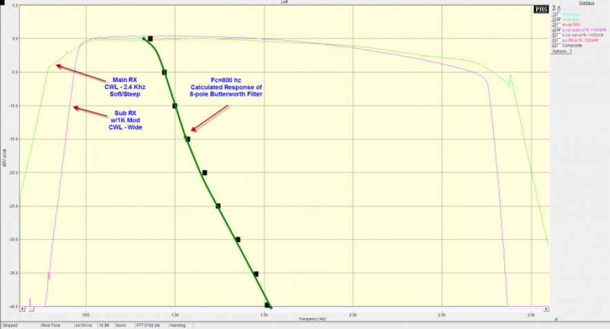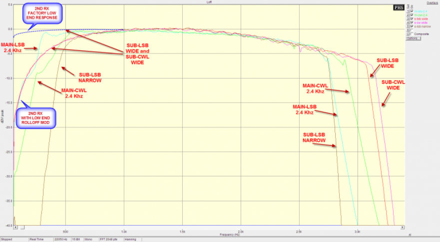 - The main RX has a low end roll-off at about 300 Hz in LSB (blue trace) and about 540 Hz in CWL (green trace). The sub RX has no roll off (dotted blue line) in either mode.