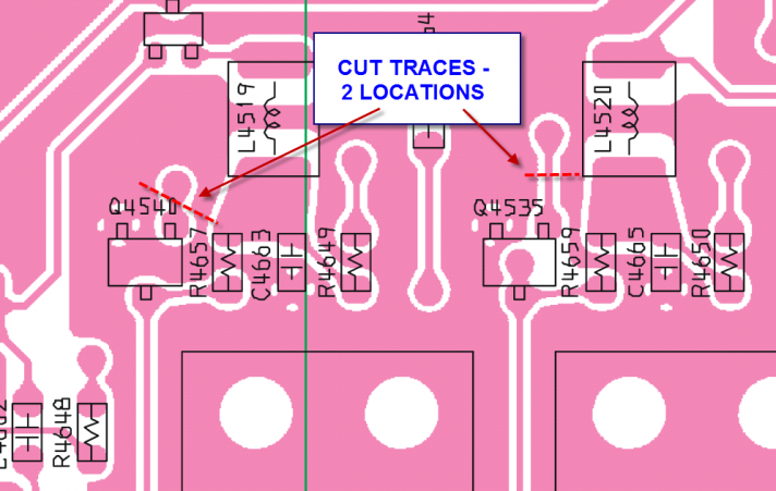 PCB preparation involves cutting the two traces indicated below. I used a very sharp x-acto blade. PCB Trace Cut Locations