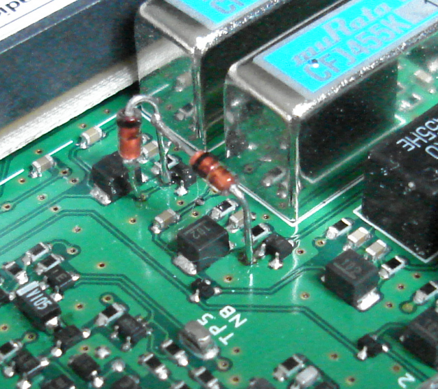 A Better Solution? - The 1K Filter ModThe roll-off mod detailed above works great in making the rig *sound* better. But it does not provide a meaningful amount of close-in selectivity. The roll-off is just too gentle. As speculated earlier, a better solution would be to try to work out a mod such that the narrower 1K filter in the CW-wide position. The benefit of using the narrower filter is that the low end would have a steep attenuation similar to what we enjoy with the narrow 300/500 Hz option. Adding a variable frequency multi-pole LPF filter on the AF output (located in the speaker?) - along with a 2-pole Q=10 bandpass filter to bring the APF would result in the sub having quite similar capabilities to the main receiver's DSP. A prerequisite to doing this mod is to have the ability to determine when the RX is in the CW mode. Unfortunately, there does not appear to be separate mode decode lines off of the serial to parallel link to the control board. There is a CW indicator on the VFD, which implies a matching CW line somewhere on the control board which could be routed for the purpose of switching the filter. Instead of hunting this down, I decided at the beginning to test the approach just to simply route both the 2.2 and 1.0 KHz filter switch lines together through a diode pair - such that they enable the 1.0 KHz filter in all cases. As a result, the 2.2 kHz filter is unused following the 1K Filter Mod. This turned out to be no significant compromise because the actual width measured of the 1KHz filter was closer to 2KHz! 1K Filter Mod - Surgery Road-mapThe mod involves cutting the two traces which lead to the darlington pair which drive the PIN diode switching. Then, adding a set of diodes which serve as an OR function - so that the 1KHz filter PIN diode line is pulled low with either a 1K or 2.2K signal from the upstream controller. Schematic follows. Note: Done carefully, this mod is fully reversible. Schematic Details for the 1K Filter Mod