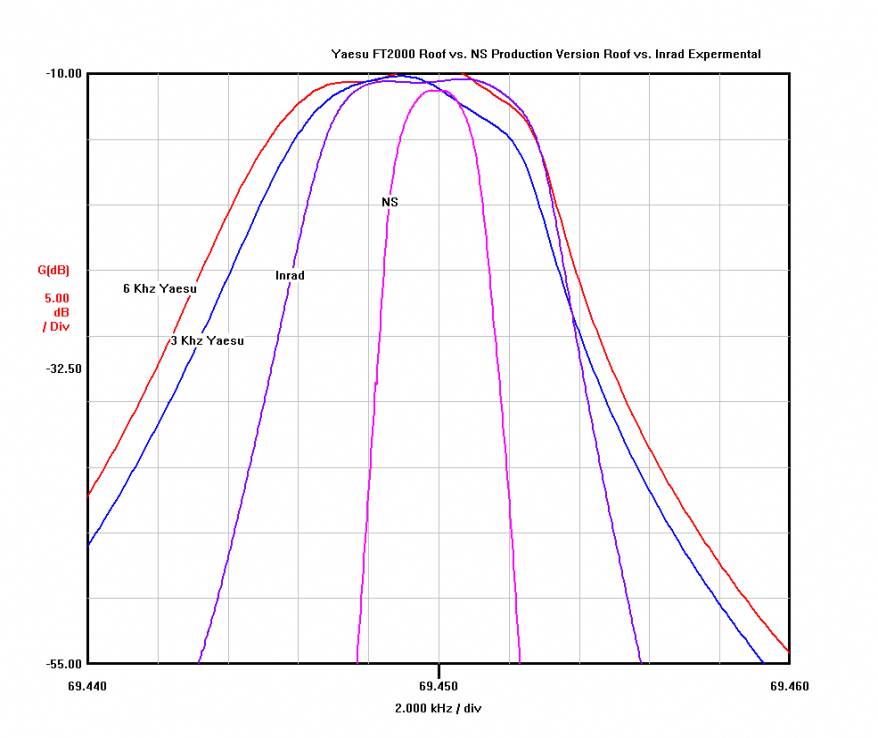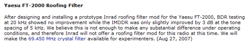 The bandwidth of the filter characteristics are unclear - listed as a "4-5 kHz" filter on the top line, and under the bandwidth section, "4000 hz." No transmission plot is provided for the filter. 50 ohms nominal termination with the correct center frequency for the FT-2000. Insertion loss is not given specifically, but rather generally in the table where I interpret it to be as "<6db" typical The Statement The confusion stems from this statement found on the announcements portion of the Inrad web site linked here: http://www.inrad.net/inrad.php?mode=announce , and which says: