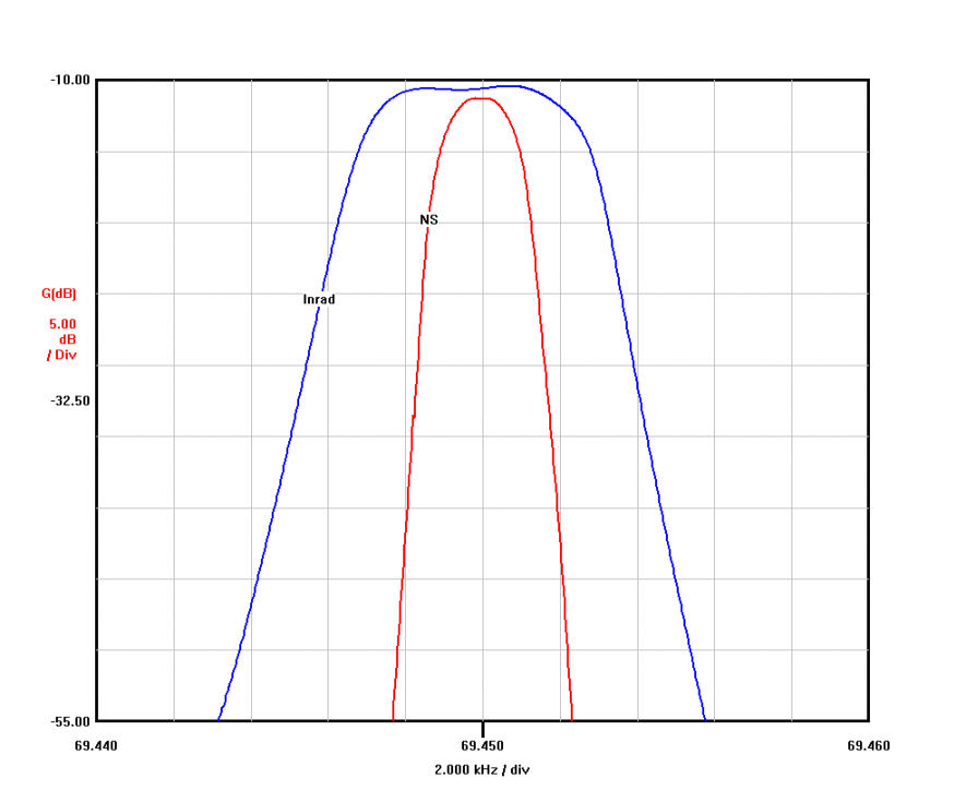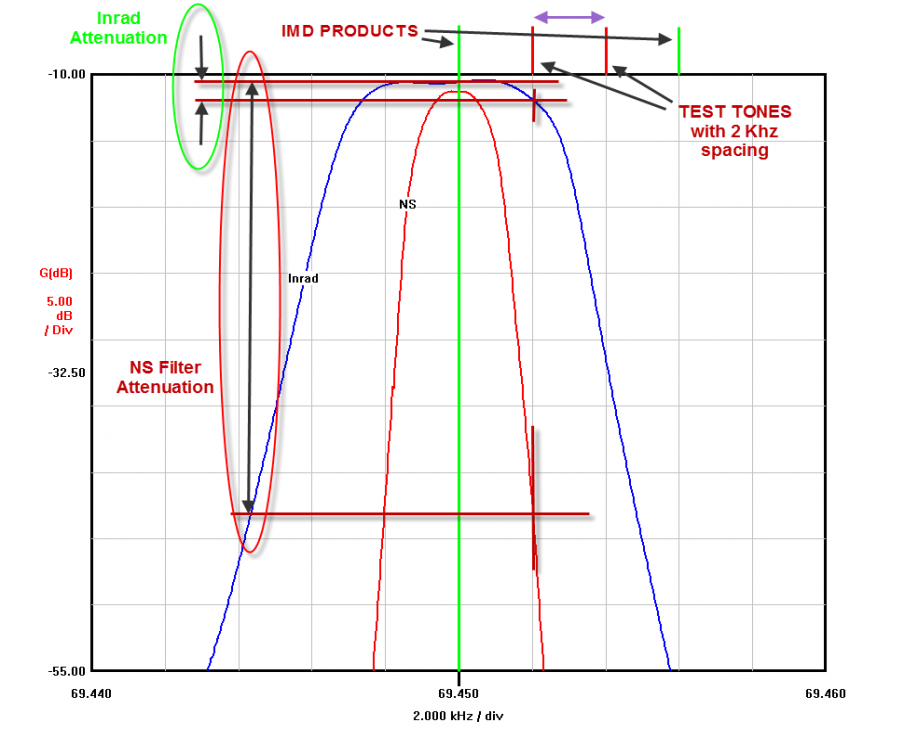 IMDDR3 Testing Comments Both Daniel and Charlie have prior published works that have reported varying levels of improvement using the Inrad filter both alone and in combination with splitter termination and other complicated mods. Generally these mods provided better performance improvement than the Inrad claim of "about 3db." In an analysis of the filter response, we can see take a good look at where the benefits they observed come in. And see how the NS filter looks in comparison. For the VNA plot analysis below, the red vertical marks represent the location of the primary test tones. The green vertical marks represent the location of the third-order IMD products which are created within the first mixer. A DR3 test can be thought as simply the difference in the levels of these two tones within the rig (the IMD product vs. the primary test tone). The benefit any roofing filter provides is in it's ability to provide attenuation of these adjacent signals. And by suppressing the level of these unwanted signals, the downstream mixer, amps and other parts of the receiver strip have only our primary signal of interest to contend with. So both the levels of the IMD products generated at the first mixer, as well as overload by-products of the follow-on stages is minimized. Each vertical division in the graph is 5db. We can see that the attenuation of the nearest tone by the Inrad filter to be 1-2db on the right side, and almost zero benefit on the left (an effect of the wide passband and off-center filter tuning). By comparison, the NS filter is providing about 33 db of attenuation at the similar point. The attenuation seen here does not translate directly into the a 1:1 benefit in DR3, however, we can conclude from these graphs alone that the improvement in the rig's performance due to the Inrad filter shape is expected to be very minimal when using the Inrad filter. And by the same examination, we can expect - and in fact do see - a huge improvement with the use of the far more selective NS filter.