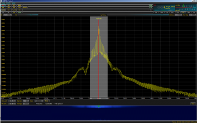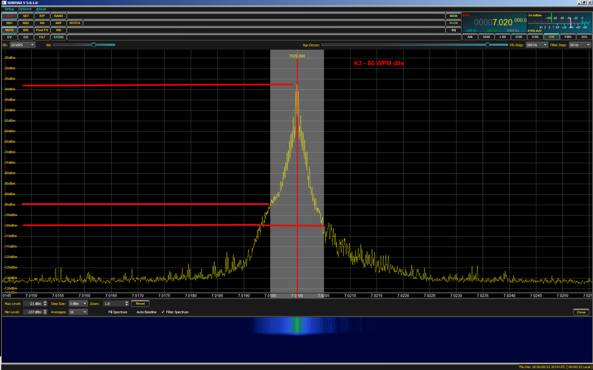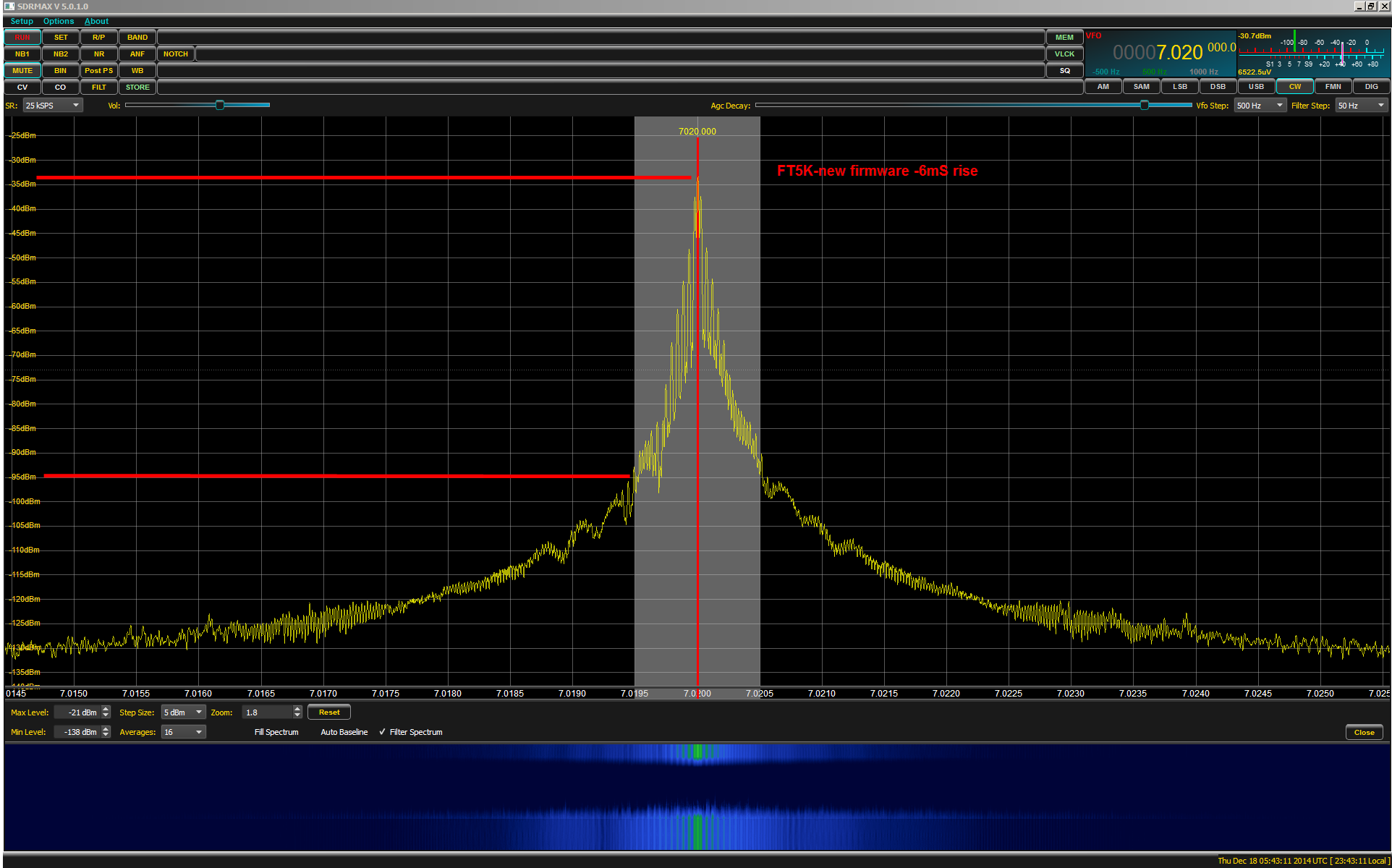 Putting firmware 0127/0547 to the test Yaesu issued a firmware update with the description "CW keying bandwidth is improved." Below we take a look at some of the test results and assess the effectiveness of the new code version. At the end, I have pulled the same data from the K3 for comparison. Test results were gathered using a QS1R. Rigs were run at full power (200W Yaesu, 100W K3). I had considered using the Rigol SA but the RM noise was judged to be too high for close-in analysis. CW mode; 60 WPM dit string. CW Occupied Bandwidth - before update The FT-5000 provides 4 user-adjustable settings for rise time. As the rise time is shorter, the occupied bandwidth should be degraded. The plots below are arranged in 6-4-2-1 mS sequence. Signal levels at an arbitrary bandwidth of 1 KHz provides a basis for comparison, although the Yaesu has quite a spread of energy content at about the -60 dBc level as can be observed from the single and double bump shoulders seen in the plots. 6 mS - click for full-size view  4 mS - click for full size view