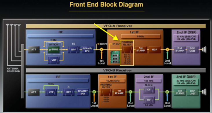 Inquiring minds want to know if the advertised characteristics of this filter match up with the actual performance - and how the important but never publicized value of group delay looks. Bench work was taken from a XF-126CN filter characterized using the veneruable N2PK VNA. Data was confirmed by a 3rd party independent lab - a step taken because the termination of the filter is around 500 ohms in the nominal case and the normal work I do is all close to 50 ohms. It was great to see nearly perfect agreement between the data taken here and that of the professional lab. BackgroundThe FT-5000 is a departure by Yaesu from a string of up-converting architechure rigs to a down-conversion. This move is surely driven by the market's focus on the close-spaced DR3 performance and the technological difficulty/expense of making high-performance VHF narrow filters with acceptable IMD characteristics. The location of the filter is listed in the block diagram shown below. The rig has quite a variety of filters available for the operator's selection. And on the serious selectivity end, a 3 Khz, 600 hz and a 300 hz. The 300 hz filter is what we are considering in this analysis.