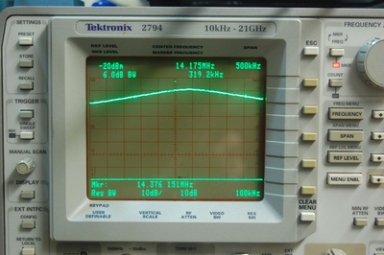 Measurements of the individual units are shown in the following plots. Thanks to Mitch Fipps, N4MF. As can be read from the screen shots, the bandwidth measured by N4MF tracks very closely to the RSGB data: 80m: 95 KHz @ -6 dB 40m: 234 KHz @ -6 dB 20m: 319 KHz @ -6 dB