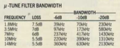 What the filters will not do is improve close-in signal performance. The filters are fantastically wide compared to the 1st IF filter in any of the current Yaesu rigs (40-400 KHz for the uTune vs. 300 Hz-6 KHz for the first IF crystal filters). But for an out-of-band problem signal, the extra bit of attenuation is repaid in IMD reductions at a ratio of 3:1. For example, a 10 dB drop of one of the strong signals would result in a 30 dB drop in the IMD product signal levels. Some owners report that there is a second potential benefit of the filter in that general band noise is reduced. This benefit is likely due to the insertion loss of the filters (about one S-unit) rather than the filtering action itself; for example 6 dB of signal attenuation (which the uTune filters provide) serves to drop any IMD products present by 18 dB. For further information and analysis of the rig's band-pass filters, see this link (Rig Preselectors in the So2r web page tab). VNA MeasurementsAs part of the FT-2000 review, Peter Hart of the RSGB provided this measurement information on the uTune units. Take note of the -6 dB bandwidth which ranges from 39 KHz (160m), increasing to 360 KHz (20m).