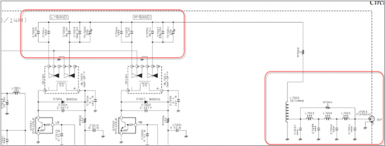 Measurements and Observations of the uTune Filters What It IsThe Yaesu uTune units are a simple LC filter with two special features. First, the coil is designed to be a high-Q type so that the bandwidth of the filter is minimized. And secondly, the tuned point of the filter tracks the rig's frequency automatically. A similar filter (albeit manually adjusted) is incorporated in the FT-2000 and FT-5000 in the guise of the VRF. The key components of the uTune unit are seen here in this schematic extract from the FT-dx9000 which featured the uTune units as part of the standard equipment offering.