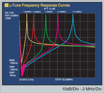 Yaesu has impressive advertising copy supporting the uTune units. However, the actual purpose of the uTune unit is to provide additional filtering of extremely strong out of band signals and reducing IMD products within the rig's front end. An example of this would be strong shortwave BC stations adjacent to the 40m band. These signals would pass through the rig's band-pass filtering and hit the mixer unattenuated, potentially causing IMD products to show up in the rig's 1st IF passband. The filter looks very sharp in the Yaesu advertising graphic (blue box graphic below), but consider that the frequency scale for that graph is 20 MHz wide.