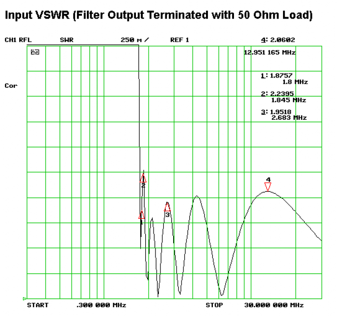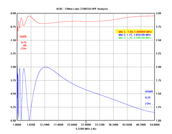 Z10022A Advertised Typical Performance Plot Analysis The objectives of the bench evaluation were to confirm the rejection claims made on Jack's web page. Looking at this plot for the 1.8 MHz loss of this plot pulled from Jack's site, the 1.6 db number is found on plot tick A (highlighted in yellow). Stopband attenuation is at the floor of Jack's plot indicating >100 db levels.  A 1 db Chebyshev design should have around 1 db of ripple in the passband. And on this chart from Jack's site we can get a feel for the ripple in the passband – around 0.75 db by “eyeball” interpolation… Data point #4 from the graph is at 0.6 db - within the 1 db designs expected range.  The last metric of interest on our tests today were input match. Here we can see SWR on Jack's data at 2:1 across the passband with a bit of a peak at 1845 KHz… Note that SWR match is really a "critical" metric from a receiver standpoint - in that very slight loss due to SWR is generally negligible. However, small variations in component values from the ideal can radically alter the SWR. And so we can get another quick check of the sample in hand vs. the web site data by comparing the input SWR plots to what we would measure later on the bench.  Z10022A on the AC0C Bench The test setup on the AC0C bench is composed of an N2PK version 4 VNA, RG400 double-shielded coax and BNC terminations. A calibration run was made prior to the test. Metric: Loss at cutoff. Specification: -1.6db typical Data: Actual measured loss at cutoff –1.6db @ 1.8 MHz (red marker #1). Result: Match Metric: Passband ripple. Specification: 1 db typical (based on design) Data: Ripple levels - about 0.6 db in the passband from the cutoff frequency - all the way up past the 6m bandspace. [Jack does not show data beyond 30 MHz but I wanted to see what 6m looked like because today's typical HF rig covers 6m in most cases.] Result: Match Metric: SWR - 3:1 or less - (check for approximate match between advertised and measured levels) Data: SWR under 2:1 at all points in the passband – and no sign of a peak around 1845…. Both measured values and the plot from Jack's site are a good match. Result: Match  Metric: Stopband attenuation: > 90 db typical Data: >90 db. Reaching 110 db (essentially at the limit of the VNA noise floor) at some points. Result: Match  What about IMD? The only other metric that may be considered as interesting would probably be IMD. For example, a pair of very strong BC stations picked up the the feeding antenna into the filter - that should generate some level of IMD products which could be detected in the passband. However, I don't believe this to be a significant omission or issue of worry for a few reasons. Strong signal IMD testing is extremely difficult to perform because at the levels these passive components would start to produce DETECTABLE levels of passive IMD is already in the approximately 0 dbm range or much higher (this is primarily a function of core saturation, in this example). Having very strong signals is not enough. They need to be spaced perfectly. In fact, the IMD product needs to be located near the signal of interest in your ham band - within a few KHz. That's a combination of events that is just too extreme to be considered a real issue. In a typical station, there are going to be dozens of spurs and birdies caused by sources inside the shack and neighborhood which are going to be far more likely to give you trouble than the ideal combination of IMD phantoms associated with this filter. In fact, If you have two BC stations that are that strong, IMD phantoms from this filter are going to be the very least of your worries. Overloading the front end to the point of possible damage is a more likely scenario! One other consideration: there is some comfort in considering that one of the few guys doing serious characterization of filter components at extreme signal levels is...Jack Smith. To get a feel for what Jack does in his spare time, you can take a look starting here, for example... http://www.cliftonlaboratories.com/ferrites,_inductors_and_transformers.htm So to my thinking - buying a filter designed to protect against strong signals from a guy who is doing work in the field is pretty logical. ConclusionsThe data support the rejection claims advertised with the filter. It clearly works as designed. If you have problems with a AM broadcast station giving you problems below 160m, the Z10022A will terminate those problems with extreme prejudice. In my configuration, I have the filter in the RX antenna input loop along with a splitter that feeds my skimmer server array. It is exceptionally cool to have the rig tuned to a BC station - and then enable the HPF filter - to see the BC station completely disappear from AF feed as well as from the attached bandscope. ---------------------------------------------------------------------------------------------------------------------------------------------------- I'm a cheer-leader for products that work as expected. Few products are perfect and without compromise. However, generally speaking, the stuff Jack makes is designed, tested and can be expected to work as advertised. As I have noted in the Microham MKII comments elsewhere on the site, this attribute is too rare in our modern high-tech world. And when excellent performance is observed, it should be singled out as such. The Z10022A is such a product. |